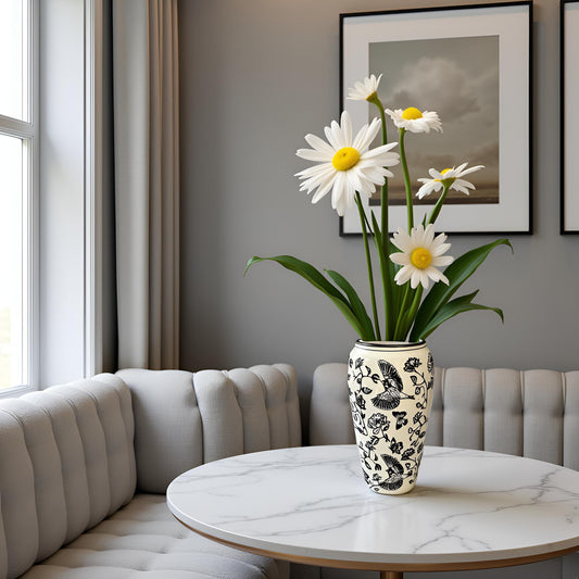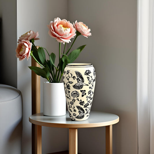 Elegant Black & White Ceramic Vase with Bird and Floral Design (Large)