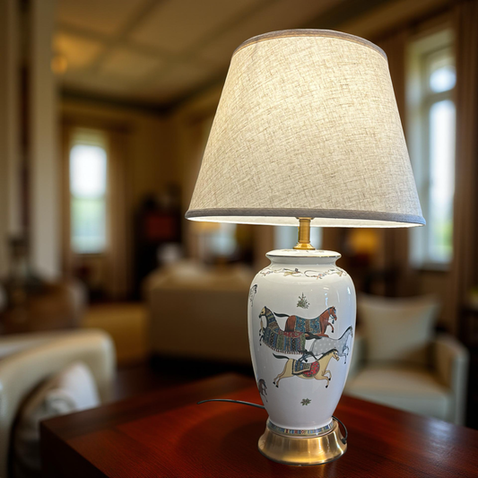 Classic White Ceramic Lamp with Horse Pattern – Premium Tabletop Light