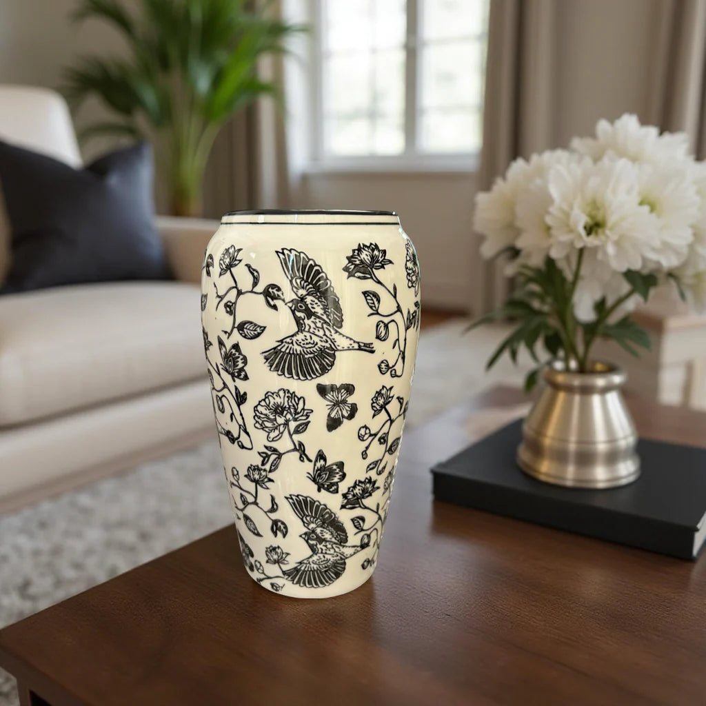 Elegant Black & White Ceramic Vase with Bird and Floral Design (Large)