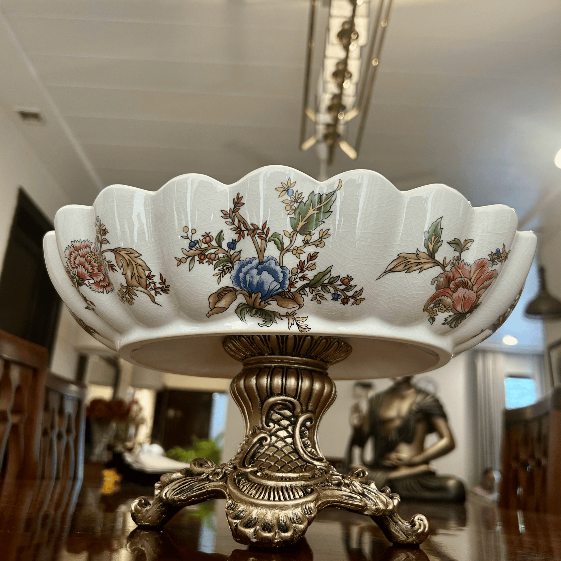 Elevate your table décor with this elegant floral ceramic serving bowl, beautifully crafted with a scalloped edge design and intricate multicolor floral artwork. Resting on a luxurious golden stand, this bowl doubles as both a functional serving piece and a decorative centerpiece for your dining or living room. Perfect for serving fruits, dry snacks, or festive treats, it also makes an excellent gift for special occasions.