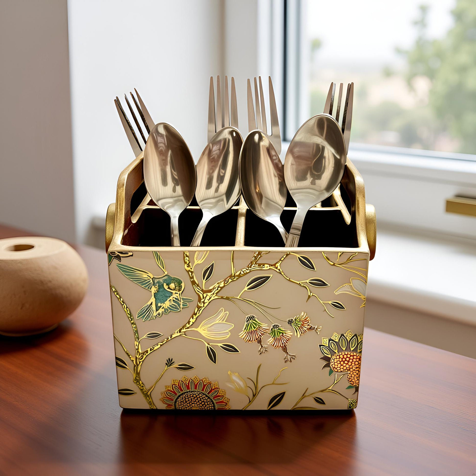 Elevate your table setting with audacious style. This striking four-slot cutlery holder from the Golden Aviary Collection commands attention with its bold design and luxurious finish. Perfect for organizing forks, knives, and spoons with flair, it transforms everyday dining into an occasion. Whether you're hosting an intimate dinner or displaying your refined taste, this statement piece brings sophistication and drama to your tableware. A fearless choice for those who refuse to settle for ordinary.