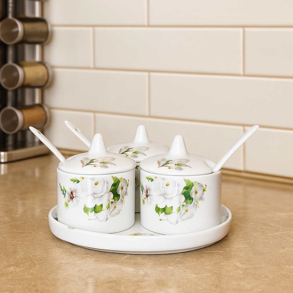 Bring grace and subtle charm to your kitchen with the Ivory Bloom spice jar set. Featuring a serene white floral pattern with matching lids and spoons, this trio rests neatly on a coordinating tray. Ideal for condiments, spices, or pickles—it’s where functionality meets refined simplicity.