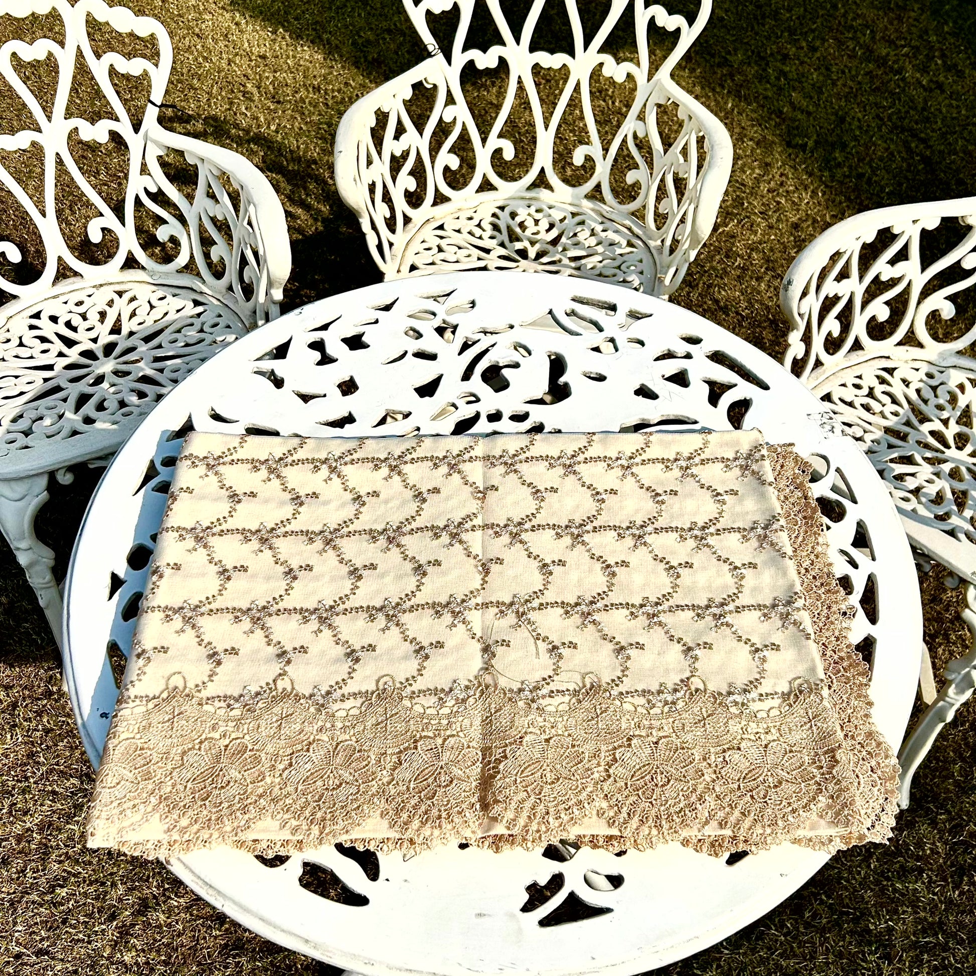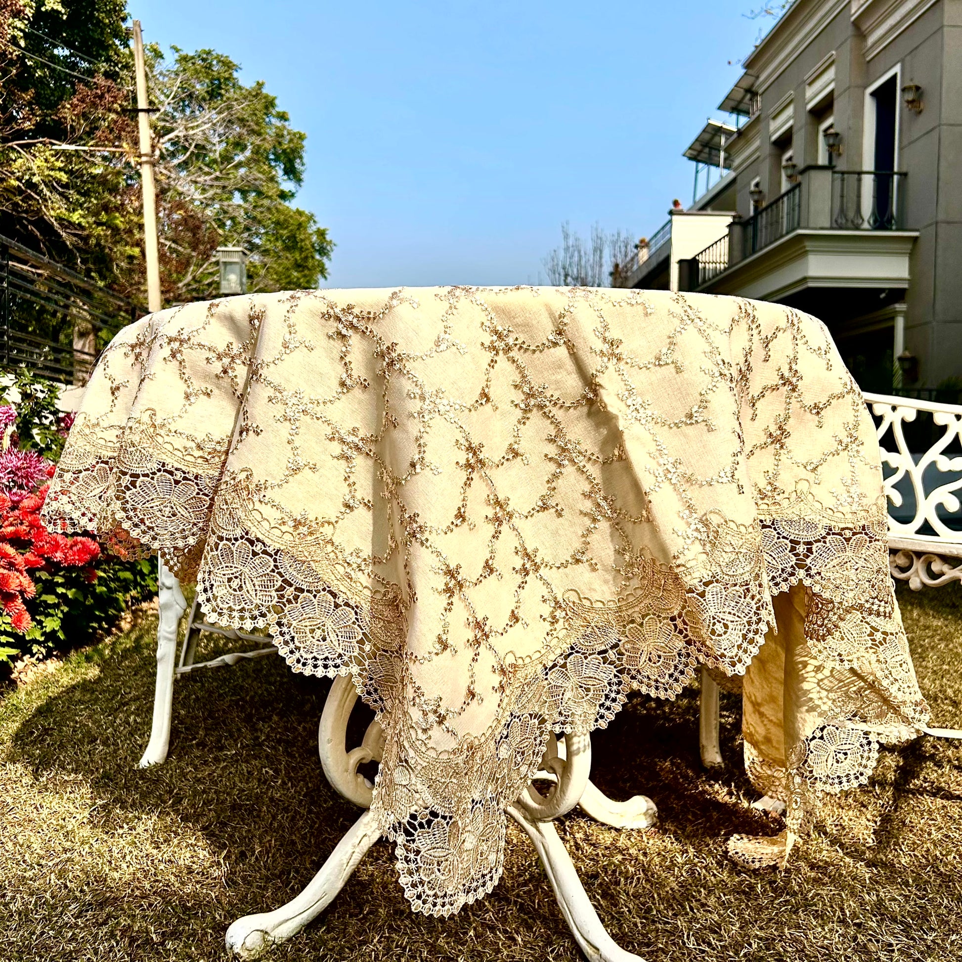 Transform your dining space with this stunning ivory embroidered round tablecloth that commands attention. Intricate embroidery meets delicate lace detailing along the border, creating a bold statement piece that refuses to blend into the background. Perfect for those who dare to elevate their table setting beyond the ordinary, this tablecloth brings sophistication and drama to every meal. The rich ivory tone pairs effortlessly with any décor while the ornate lace border adds an unexpected edge of elegance. Make your table the conversation starter it deserves to be.