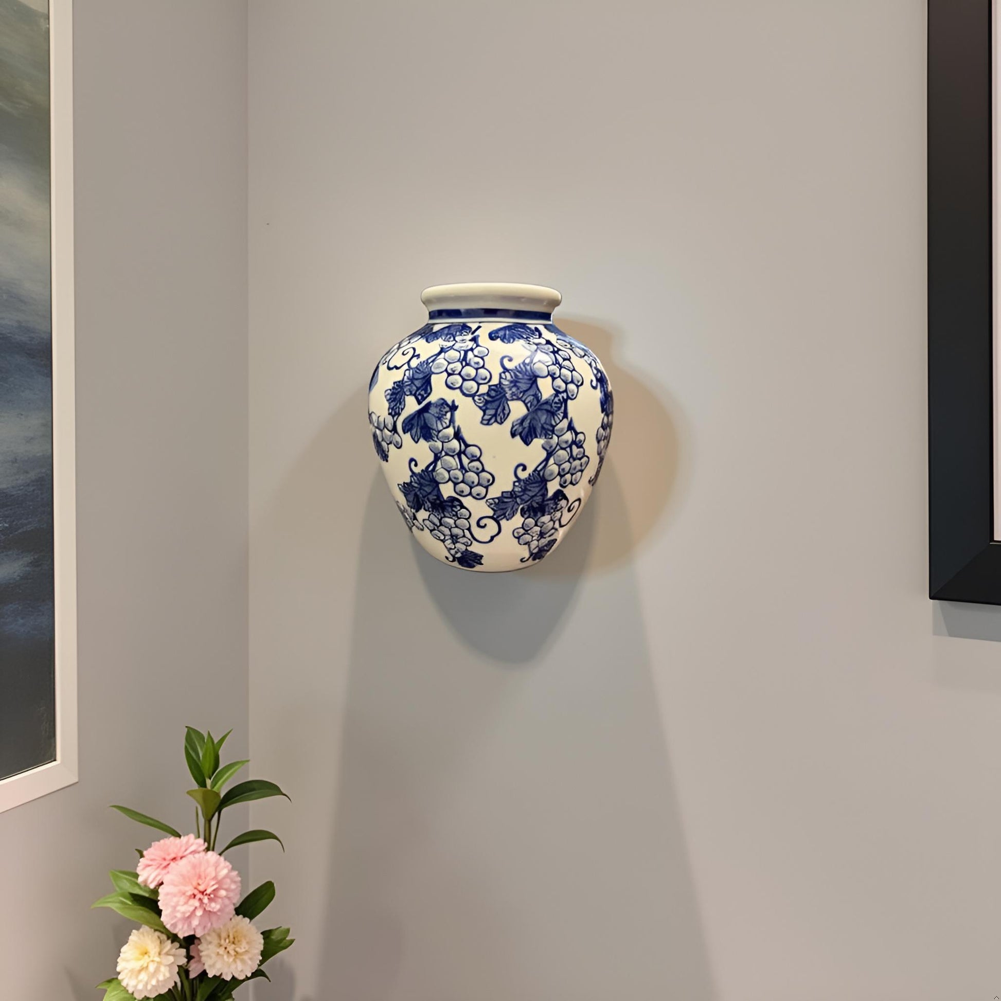 Enhance your interiors with this elegant blue and white ceramic wall hanging jar, featuring a traditional grapevine motif. Designed to be mounted on the wall, this handcrafted décor piece adds a unique touch of artistry and sophistication to living rooms, dining spaces, hallways, or entryways. Perfect as a standalone statement or styled with other ceramic pieces, it also makes a thoughtful gift for weddings, housewarmings, or festive occasions.