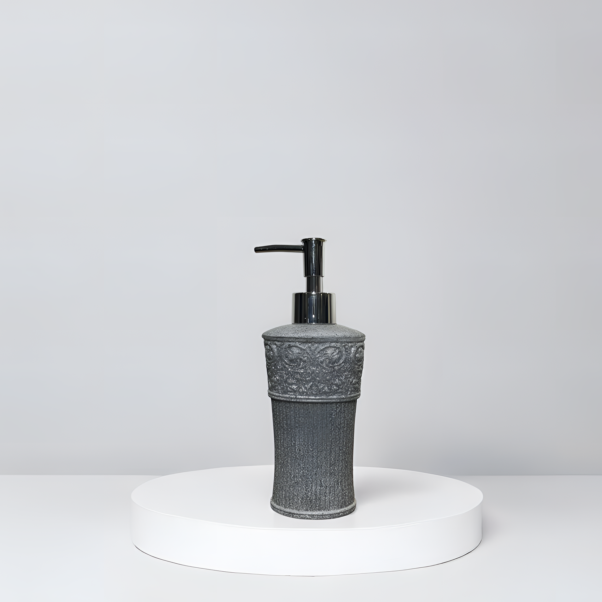 Enhance your sink space with this stylish textured grey resin soap dispenser. Featuring an ornate carved upper design and a sleek, contoured base, this dispenser adds a touch of sophistication to any bathroom or kitchen. Made from durable, high-quality resin with a modern chrome-finished pump, it’s perfect for dispensing liquid soap, lotion, or sanitizer with ease and elegance.